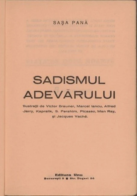 Front page of Sadismului adevărului by Sașa Pană (illustrations by Victor Brauner, Marcel Janco, Jarry, Kapralik, Perahim, Picasso, Man Ray and Vaché)